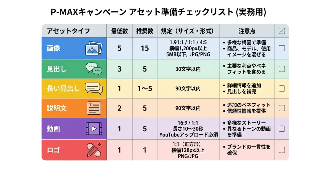 P-MAXのアセット準備は、量と質の両面が重要です。Googleは各アセットタイプについて複数の登録を推奨しています。具体的には、画像は最低5枚(推奨15枚)、見出しは最低3個(推奨5個)、説明文は最低2個(推奨5個)を用意します。動画がある場合は、最低1本(推奨5本)を登録すると、YouTubeやDiscoverでの配信機会が増えます。