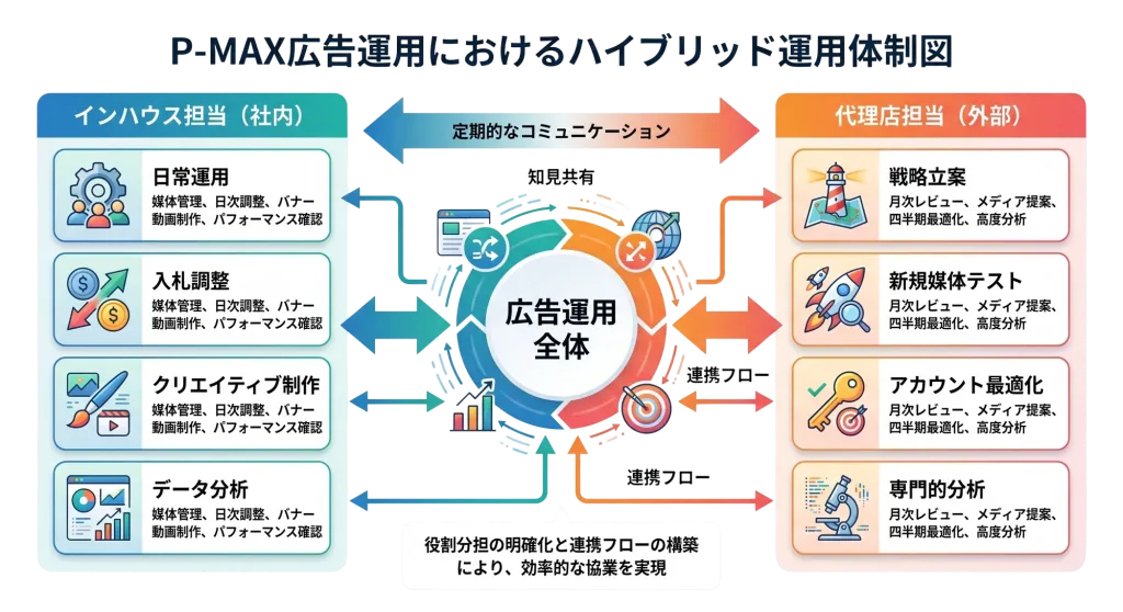 インハウスと代理店の二者択一ではなく、両者の強みを組み合わせたハイブリッド運用が、多くの企業にとって現実的な解決策となっています。例えば、日常的な運用と入札調整は社内で行い、月次の戦略レビューや四半期ごとのアカウント最適化を代理店に依頼するモデルです。